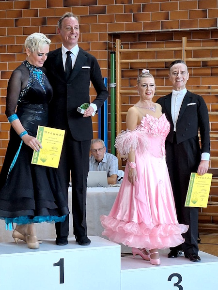An beiden Tagen starteten sie bei einem Masters III S Standard-Turnier. Wenn auch die Startfelder nicht übermäßig groß waren, so waren die teilnehmenden Turnierpaare durchaus leistungsstark. Gregor und Alexandra tanzten an beiden Tagen das Finale und kamen beides Mal mit einem 3. Platz direkt aufs Treppchen. Ein durchaus gelungener Einstieg in die Sonderklasse. |